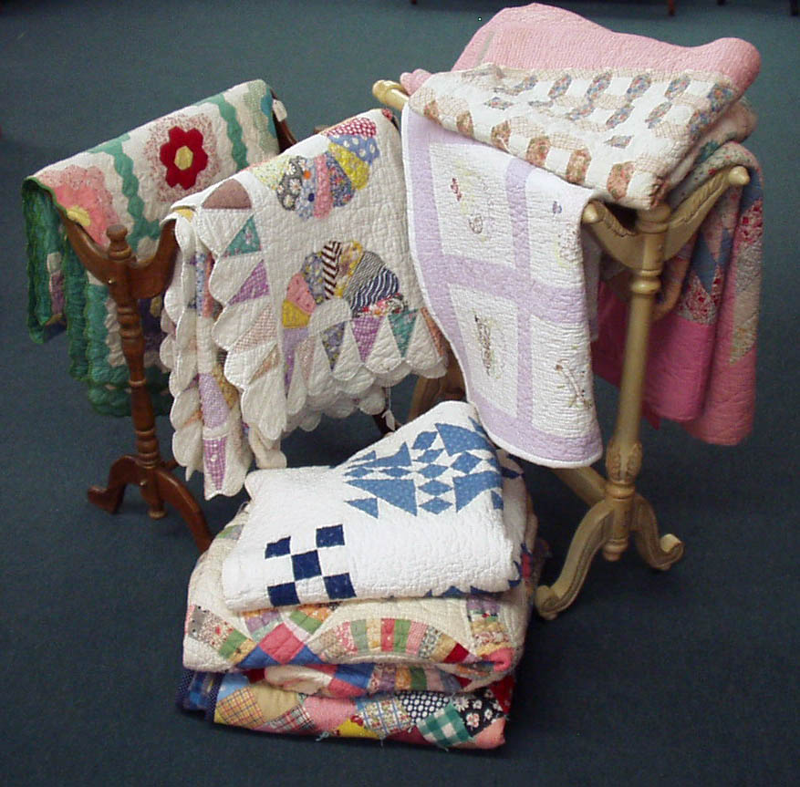 A wonderful selection of linens and sewing collectibles are available including treadle and Featherweight sewing machines, quilts, aprons, hankies, doilies, tablecloths, books, notions and more.