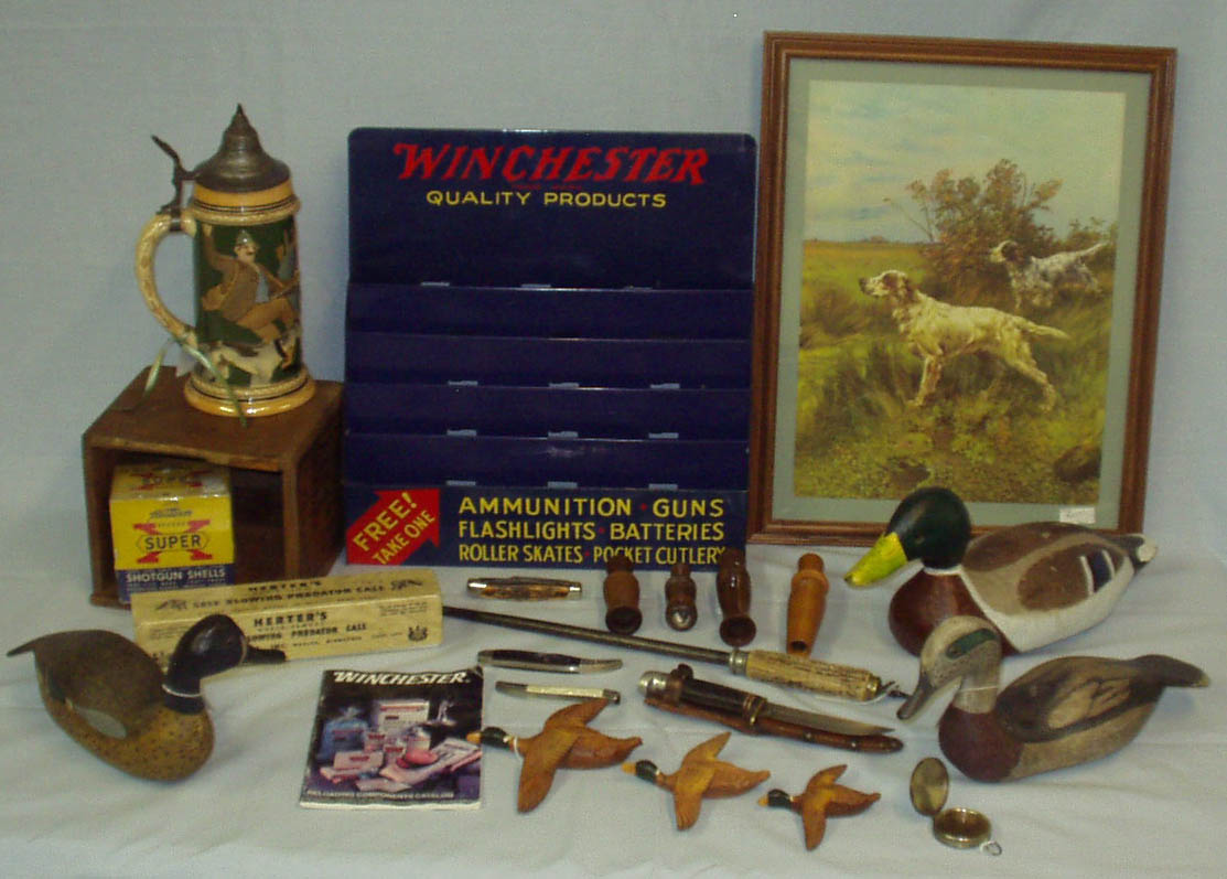 We carry vintage hunting, fishing, and outdoor sporting items such as Winchester collectibles, fishing rods reels, lures, creels, decoys, animal calls, snowshoes, skies, and team sports collectibles.
